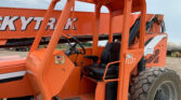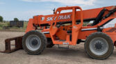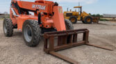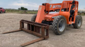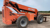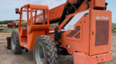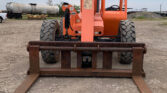 The 2014 JLG 8042 telehandler has 871 hours and is powered by a 3.261L Cummins QSB3.3 diesel engine with a Powershift transmission (4 forward, 4 reverse) and four-wheel drive. It features a canopy, crab and four-wheel steering, and a maximum lift capacity of 8,000 lbs with a 42′ lift height and 3-stage boom. The telehandler includes 48″ forks, auxiliary hydraulics, a tilt carriage, hydraulic leveling, and a manual quick attach. It is equipped with foam-filled 370/75-28 tires and an 8,000 lbs counterweight.